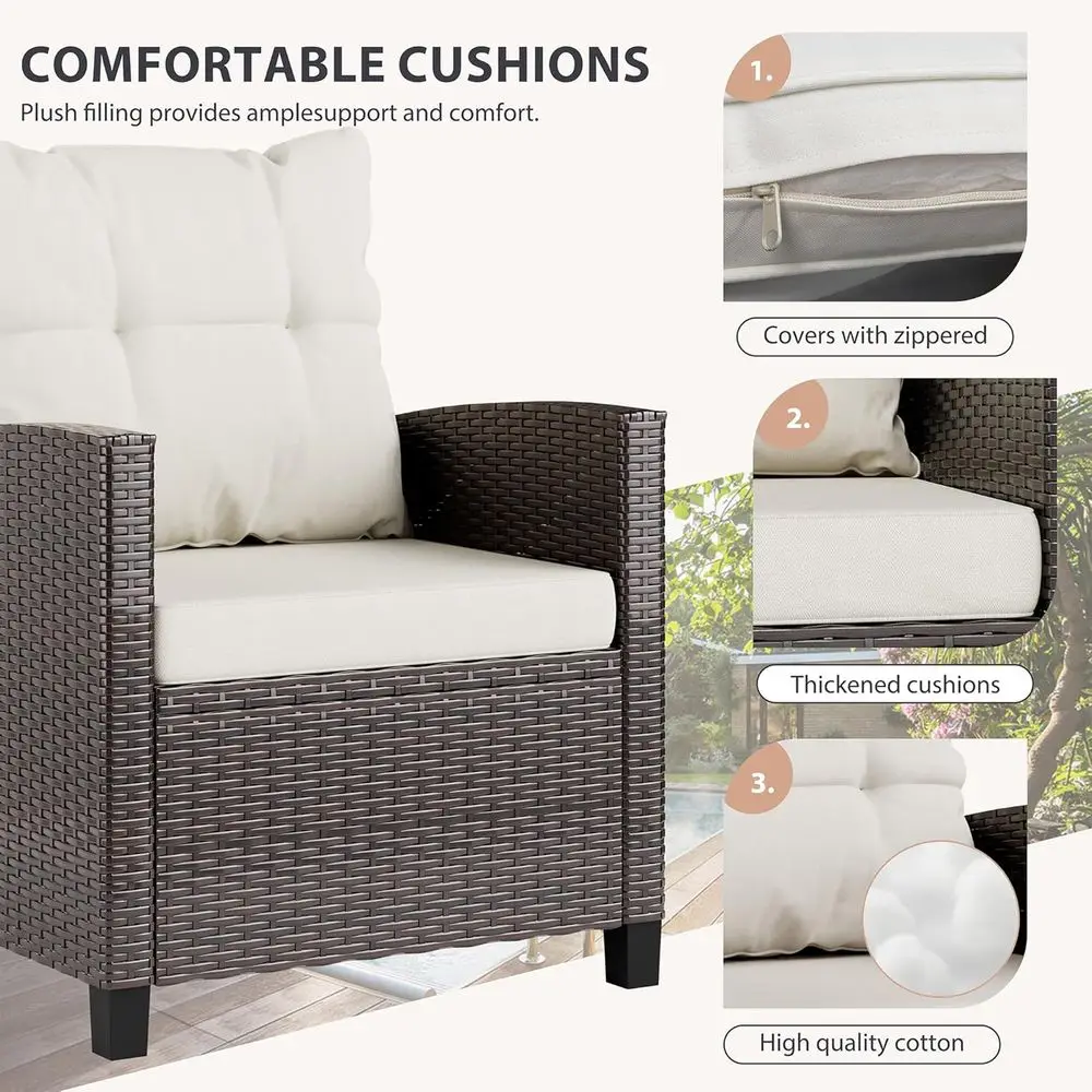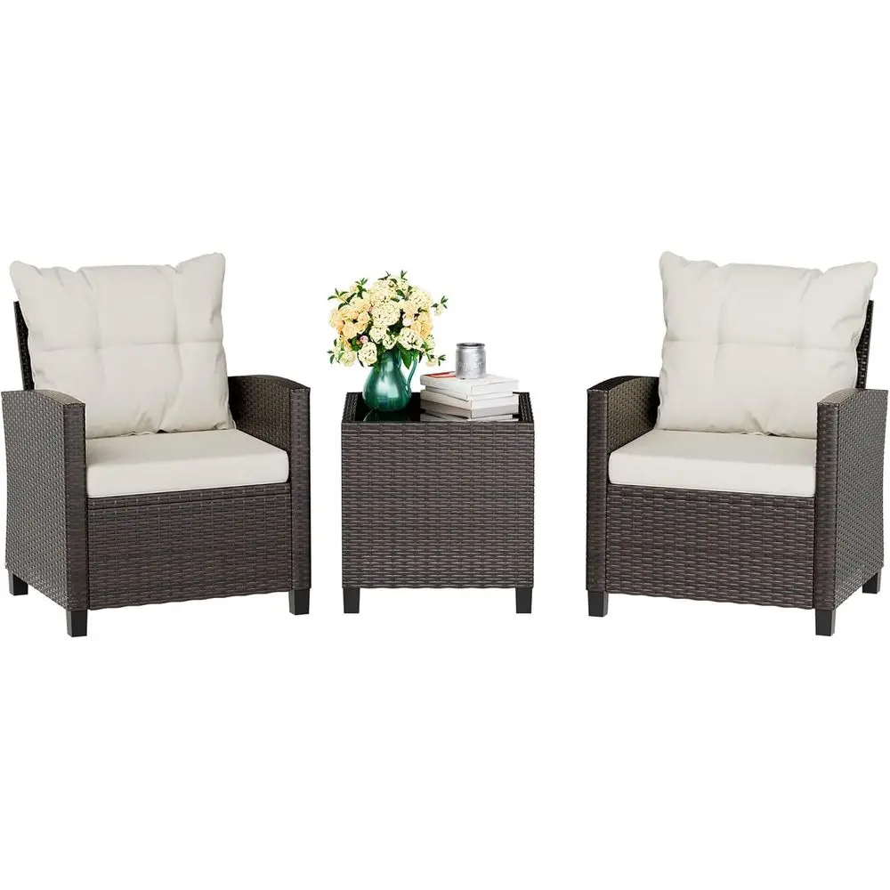 Compact Outdoor Wicker Bistro Set with Cushioned Chairs and Glass Table for Patio, Garden, Backyard, Balcony, Poolside (Beige)