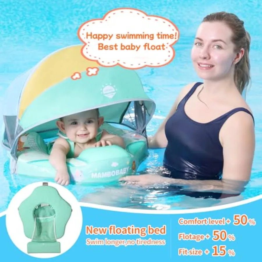 Non-Inflatable Baby Swim Float with Pearl Foam Tail for Infants Solid Water Float in Blue Sun Canopy Anti-Flip Design for Pool